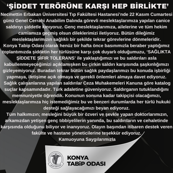 Sağlıkta Şiddeti Lanetliyoruz!Selçuklu 61 Nolu Şehit Ufuk Aile Sağlığı Merkezi'nde görevi başında saldırıya uğrayan meslektaşımız Dr. Ahmet Tolu'ya ve tüm sağlık camiamıza geçmiş olsun diyoruz...